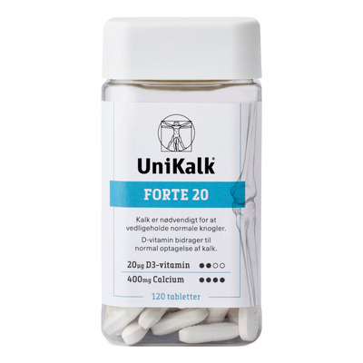 UniKalk Forte 20 indeholder både calcium og D-vitamin. Behovet for et ekstra højt tilskud af D-vitamin kan opstå af flere årsager. Hvis man er mere end 60 år, er behovet for at indtage et ekstra tilskud af D-vitamin meget større. Dette er gældende for begge køn. Ligeledes kan det med alderen knibe med at komme ud i solen eller spise de samme mængder mad som tidligere - derfor kan det være godt for dig at begynde på UniKalk Forte.