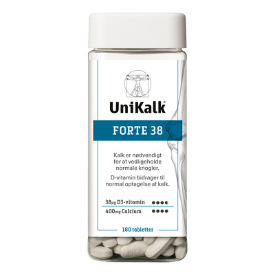 UniKalk Forte 38 indeholder en kombination af kalk, som bidrager til normale, tætte knogler, og hele 38 µg D-vitamin pr. tablet, hvilket dækker 760% af det daglige referenceindtag for voksne. Tabletterne er særligt velegnede til dig, som ønsker at supplere din daglige kost med kalk og desuden har behov for et højt tilskud D-vitamin.
