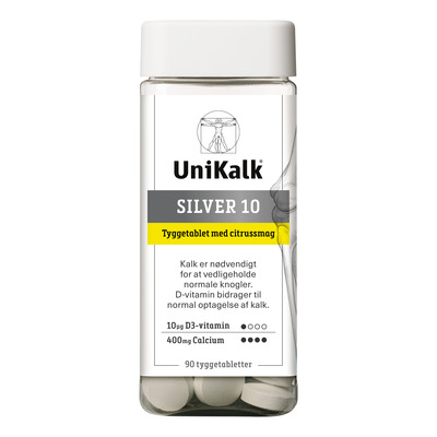 Silver 10 tyggetabletterne fra UniKalk er til dig, som ønsker at supplere din daglige kost med både kalk og D-vitamin. Med et indhold på 10 µg D-vitamin pr. tablet er UniKalk Silver derfor med til at dække et øget behov for D-vitamin i forbindelse med kalk. Tyggetabletten har en forfriskende smag af citrus og er især velegnet til dig, der har svært ved at synke tabletter og som ønsker noget, der i stedet kan tygges.