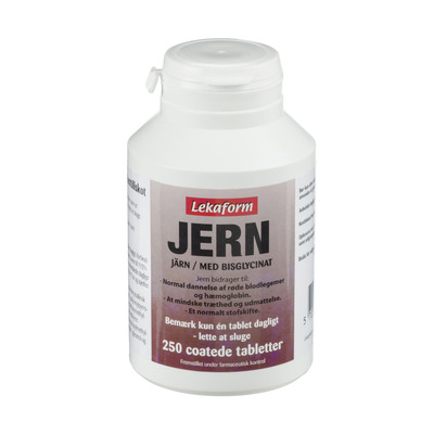 Jerntabletterne fra Lekaform indeholder bisglycinat. De er overfladebehandlet, så de er lette at sluge. To tredjedele af jernet i vores krop findes i vores blod og muskler, mens den sidste tredjedel er lagret i leveren, milten og den røde knoglemarv, hvorfra de røde blodlegemer dannes.