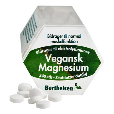 Berthelsen Vegansk Magnesium er et kosttilskud med organisk bundet og letoptageligt magnesium baseret på to veldokumenterede magnesiumkilder - aminocheleret magnesiumbisglycinat og magnesiumoxid.. Dagsdosis indeholder 375 mg magnesium, og kombinationen af netop de to kilder giver et bioaktivt magnesiumtilskud.