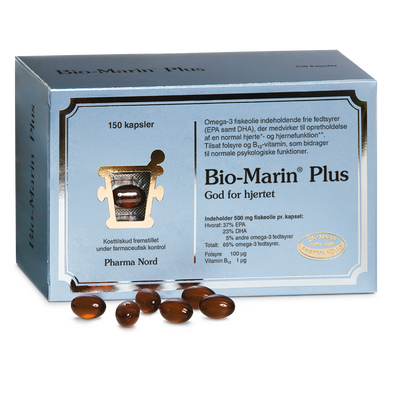 Bio-Marin Plus fra Pharma Nord består af bløde gelatinekapsler med 500 mg koncentreret fiskeolie pr. kapsel og et omega-3-indhold på 65% (38% EPA, 22% DHA samt 5% andre omega-3 fedtsyrer). Bio-Marin Plus er også tilsat B-vitaminerne folinsyre og B12-vitamin, som bidrager til at normalisere niveauet af stoffet homocystein i blodet samt normale psykologiske funktioner og et normalt immunforsvar.