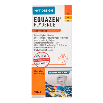 Equazen (tidligere Eye Q) flydende fiskeolie mikstur - en EPA-rig kirunalolie og kæmpenatlysolie med en dejlig frisk smag af citrus
