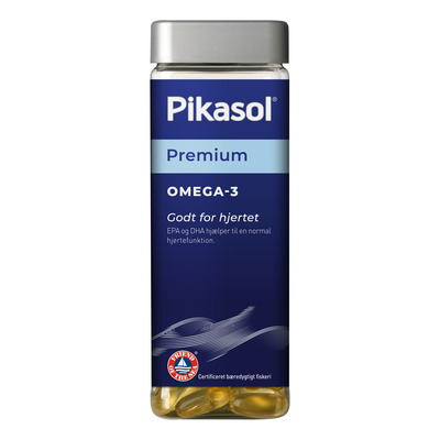 Pikasol Premium Omega-3 er et kosttilskud med ren, højkoncentreret fiskeolie, som sikrer at din krop får den anbefalede daglige tilførsel af omega-3 fedtsyrer. Fiskeolie indeholder omega-3 fedtsyrerne EPA og DHA, som bidrager til en normal hjertefunktion. Du opnår denne gavnlige effekt ved et dagligt indtag på 250 mg DHA og EPA. Ydermere bidrager DHA til oprethold af en normal hjernefunktion samt et normalt syn ved dagligt indtag på 250 mg DHA.