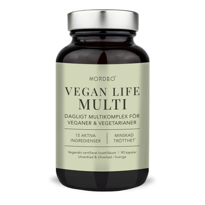 NORDBO Vegan Life Multi er et dagligt multikosttilskud udviklet til veganere og vegetarer. Det indeholder 15 aktive ingredienser, herunder vitamin B12, jern, magnesium, calcium og Panax ginseng-ekstrakt. Vitamin B12, som mange får fra animalske produkter, bidrager til nervesystemets normale funktion, en normal psykologisk funktion og til at mindske træthed og udmattelse. Ginseng er en plante med lang tradition for anvendelse i kosttilskud.
