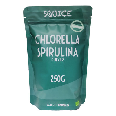 Squice Økologisk Chlorella og Spirulina Pulver er 250g blandet algepulver med klorofyl og vegetabilsk protein