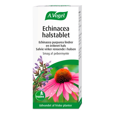 A.Vogel Echinacea halstablet indeholder de naturlige ingredienser rød solhat, salvie og pebermynte. Rød solhat kan bidrage til at støtte immunforsvaret og øge modstandskraften, mens pebermynte har en kølende virkning, der kan lindre irriteret eller øm hals. Salvie er en hårdfør plante, der dyrkes mange steder i verden og siden oldtiden har været en kendt lægeurt. Salvie virker rensende i halsen.