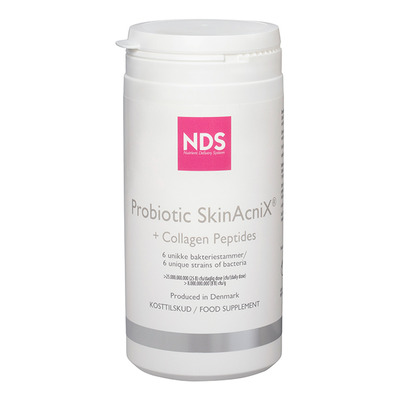 NDS Probiotic SkinAcniX er et kosttilskud med 200 g pulver. Dette pulverbaserede tilskud indeholder mavetarmbakterier/mælkesyrebakterier og er produceret med en BioAktiv teknologi. Derudover indeholder kosttilskuddet vitamin C, E og D samt collagenpeptider og mineraler som zink. Pulveret er nemt at indtage på daglig basis, da det blot skal opløses i vand og drikkes. Det har en mild smag af vanilje.