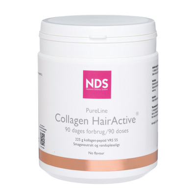 NDS PureLine Collagen HairActive er et kollagen-kosttilskud, som indeholder 2500-5000 mg VRS 55 kollagenpeptider pr. dosis, udvundet af type 1 kollagen. Kollagen er et protein, der sammen med elastin danner bindevævets fibre i blandt andet hud og hår. Kollagen type 1 findes især i store mængder her. Dette produkt er udviklet med fokus på håret, og ved indtagelse får du tilført de korrekte kollagen-peptider i effektive og veldokumenterede doser for at understøtte et stærkt og mere fyldigt hår. NDS kollagen-kosttilskud har en høj optagelighed og er 100% smagsneutralt samt vandopløseligt for din komfort.