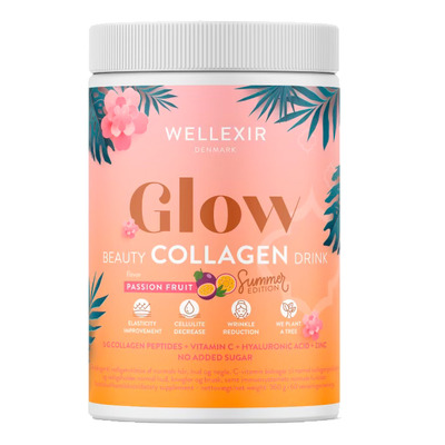 Wellexir Glow Beauty Drink Passion Fruit er en velsmagende kollagenpulver med passionsfrugtsmag - en let og læskende drik. Kollagenpulveret er tilsat vitamin C, zink og hyaluronsyre, som alle bidrager til normal hud og negle. Produktet fremmer normal kollagendannelse, som er vigtig for hud, knogler og brusk, og hjælper med at vedligeholde normal hud, hår og negle. Produktet er fri for gluten og laktose samt uden tilsat sukker.
