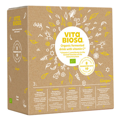 Vita Biosa Ingefær indeholder de samme urter og mælkesyrebakterier som Vita Biosa Original, men er derudover tilsat 0.5 % koldpresset ingefærsaft samt acerolabærpulver med naturligt indhold af vitamin C.