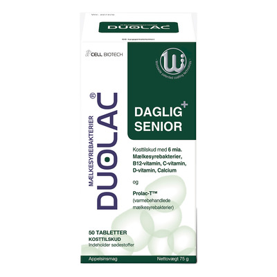 Duolac Daglig+ Senior er et kosttilskud på form som tyggetabletter med frisk smag af appelsin, der er velegnet til personer i alderen 65+. Kosttilskuddet indeholder varmebehandlede mælkesyrebakterier (Prolac-T) fordelt på 7 nøje udvalgte mælkesyrebakteriestammer. Mælkesyrebakterier findes naturligt i tarmen og bidrager til en normal fordøjelsesfunktion.