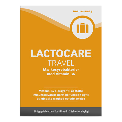 Lactocare Travel indeholder mælkesyrebakterier og vitamin B6, der understøtter din tarmflora på rejsen