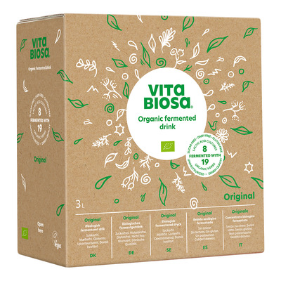 Vita Biosa Orginal Ø er en økologisk urtedrik med millioner af levende mælkesyrebakterier, og med smag af urter.