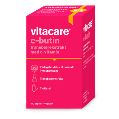 VitaCare C-butin er et kosttilskud i kapselform, som er baseret på tranebærekstrakt med C-vitamin, der blandt andet bidrager til immunsystemets normale funktion. Kapselskallerne består af vegetabilsk hydroxypropylmethylcellose, som desuden gør tilskuddet velegnet til veganere.