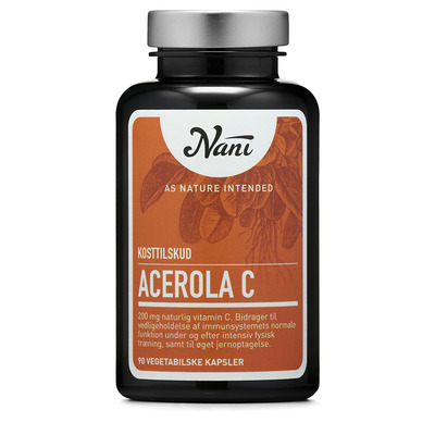 Nani’s Acerola C er nemlig en whole food, du kan tage som supplement til din kost. Og det lille acerola kirsebær er netop utrolig rigt på naturligt C vitamin. Derfor består Nani’s C vitamin tilskud blot af nænsomt håndterede acerola kirsebær kommet i kapsel til dig.