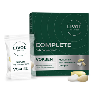 Livol Complete Voksen indeholder vitaminer, mineraler og omega-3 samlet i én daglig pose. Produktet er udviklet til voksne med en aktiv hverdag og gør det nemt at tage kosttilskud, både hjemme og på farten. Hver æske indeholder 30 poser, som hver rummer tre synkevenlige tabletter eller kapsler.