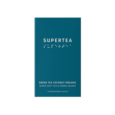 Green Tea Coconut Organic kommer i en fin, blå æske pakket individuelt i bionedbrydelige poser.