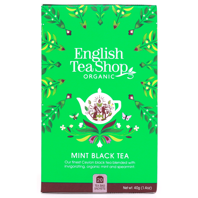 Mint Black Tea fra English Tea Shop er en super lækker teblanding, som gør det hurtigt og enkelt at brygge en opfriskende, smagsrig kop te. Den indeholder økologisk sort ceylon-te, pebermynte og grøn mynte samt naturlig pebermynte-aroma, der er med til at give den virkelig friske smag. Teblandingen kommer i enkeltpakkede sachetter i en komposterbar papæske.
