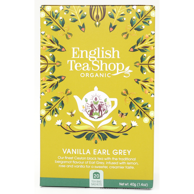 Vanilla Earl Gray fra English Tea Shop er en aromafyldt, økologisk teblanding, der hovedsageligt er baseret på sort caylon-te og bergamotolie. Derudover indeholder den citronskal, rosenblade og sødmefuld vanilje, som er med til at give et skønt pift til teen. Alle ingredienser er fra Fairtrade-produktion, og emballagen er miljøvenlig. Teblandingen kommer nemlig enkeltpakket i 20 sachetter af komposterbare materialer pakket i en nedbrydelig papæske.