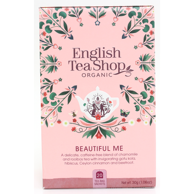 Beautiful Me fra English Tea Shop er en lækker, økologisk teblanding baseret på blandt andet kamille, gotu kola, hibiscus, kakao og duftende rosenblade med et friskt, syrligt twist af appelsin og tranebær. Derudover indeholder teen kanel, som fuldender smagsoplevelsen på skønneste vis. Denne variant kommer individuelt pakket i 20 sachetter, som endvidere er håndpakket i en komposterbar papæske.