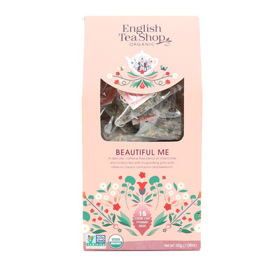 Beautiful Me fra English Tea Shop er en lækker, økologisk teblanding blandt andet baseret på kamille, gotu kola, hibiscus, kakao og duftende rosenblade med et friskt, syrligt twist af appelsin og tranebær. Denne variant kommer individuelt pakket i 15 fine pyramidesachetter håndpakket i komposterbar papæske.