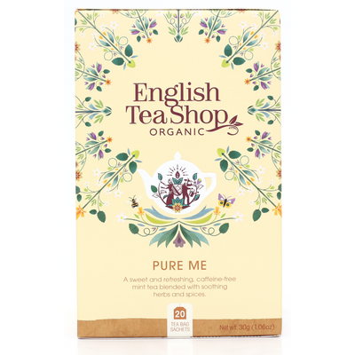 Pure Me fra English Tea Shop er en smagsrig, økologisk teblanding baseret på virksomme urter som pebermynte, bukkehorn, fennikelfrø og hyldeblomst. Pebermynte bidrager til en normal fordøjelse. Teen er naturligt koffeinfri og kan derfor sagtens nydes inden sengetid, hvis du har lyst til det. Denne variant kommer individuelt pakket i 20 sachetter, som endvidere er håndpakket i en komposterbar papæske.