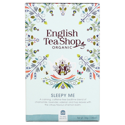 Sleepy Me fra English Tea Shop er en dejligt afslappende, økologisk teblanding baseret på virksomme urter som kamille, lavendelknopper, citronmelisse, baldrianrod og humleblade. Teen er naturligt koffeinfri og dermed perfekt at nyde inden sengetid. Denne variant kommer individuelt pakket i 20 sachetter, som er håndpakket i en komposterbar papæske.