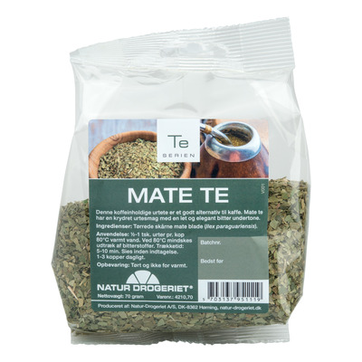 Natur-Drogeriet Mate Te er en urtete med en krydret smag og en bitter undertone. Urteen er et perfekt kaffealternativ, til dig der foretrækker te frem for kaffe! Mate Teen kan erstatte kaffe, idet den fra naturens side er enormt koffeinholdig. Den blev drukket af de sydamerikanske indianere, som gav plantens blade navnet "Yerba-Maté"
