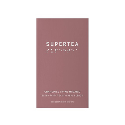 Chamomile Thyme Organic fra Teministeriets Supertea-serie er en økologisk og 100% koffeinfri urteblanding fremstillet specielt til afslapning. Den er baseret på kamille, som virker beroligende på krop og sind. Herudover indeholder teen blandt andet appelsinskal, lakrids, kanel, pebermynte, citrongræs, ingefær, timian, basilikum og sort peber, som giver en varmende og behagelig følelse.