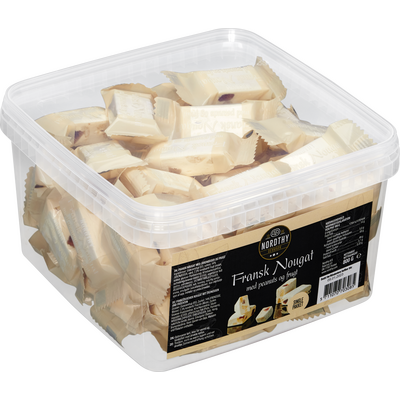 Nordthy Fransk Nougat er klassikeren som du kender den! Du får den dejligt seje konsistens med den søde smag, her tilsat peanuts og kandiseret frugt. Den franske nougat er indpakket individuelt i små kvadratiske mundrette stykker, der nemt kan serveres pænt på et fad, eller bare spises direkte af posen.