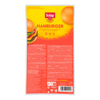 Schär Hamburgerbrød er glutenfri burgerboller i en pakke med to stk. Bollerne har en blød og ensartet struktur. De har en mild, neutral smag, som passer godt sammen med forskellige typer fyld som ost, kød, grøntsager eller dressing.
