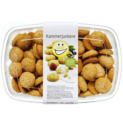 EASIS Kammerjunkere er uden tilsat sukker. De indeholder fibre og fuldkorn bl.a. fra grahamsmel og havregryn. De har en sød, krydret smag af vanille og kardemomme og så er de lidt mindre end traditionelle kammerjunkere og dermed mere mundrette. Prøv de knasende sprøde kammerjunkere oven på din favoritkoldskål.