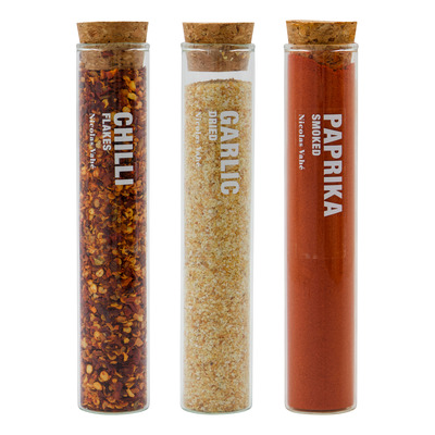 Nicolas Vahé Spices Chilli, Garlic, Smoked Paprika leveres i elegante glasrør med korklåg, der holder krydderierne friske. Brug sættet til alt fra pizza og pastaretter til simreretter og marinader. Et godt valg til dig, der elsker krydret og velafbalanceret mad.