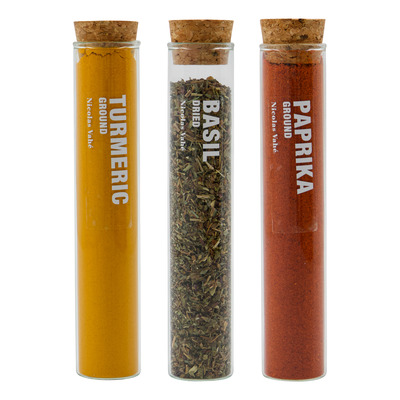 Nicolas Vahé Spices Basil, Paprika Chilli, Turmeric leveres i dekorative glasrør med korkprop, som holder krydderierne friske. De tre varianter er nemme at kombinere og tilføjer både smag og farve til dine retter. Et oplagt valg til både hverdagsbrug og som gaveidé.