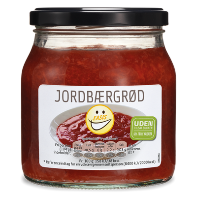 Jordbærgrøden fra Easis er en skøn, velsmagende grød baseret på 35% jordbær. Den er uden tilsat sukker. Nyd grøden, som den er, med mælk på eller eventuelt som tilbehør i kager eller trifli. Med sine 40 kcal pr. portion (104 g) er den særligt velegnet til dig, som er på en kaloriereduceret diæt.