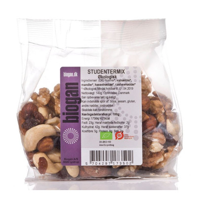 Biogans økologiske og usaltede studentermix består af rosiner og forskellige nødder. Mixen er nem at have med på farten og er god når man bliver lidt lækkersulten mellem måltiderne.