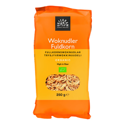 Urtekram Økologiske Fuldkorns Woknudler er lavet af 100% økologisk fuldkornshvedemel og vand - enkelt, nærende og lækkert. Nudlerne har en let fast konsistens og en mild smag, som gør dem perfekte til wokretter, supper, salater og asiatiske nudelbowls.