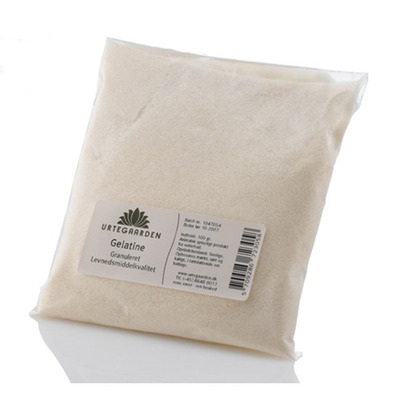 Urtegaarden Økologisk Gelatine er et lugtfrit pulver fremstillet af hud fra økologiske grise.