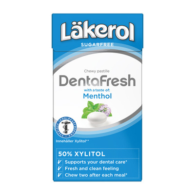 Läkerol DentaFresh - Menthol er en blød tyggepastil med en opfriskende smag af Menthol. Den giver både en frisk ånde og styrker dine tænder. Den kan med fordel tages efter et måltid.