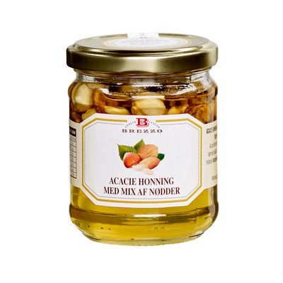 Denne akaciehonning med nøddemix fra Brezzo er den lækreste kombination af tørrede nødder og akaciehonning. Honningen er særlig velegnet til ost f.eks. på et tapasbord. Nøddemixet består af hasselnødder, mandler og valnødder.