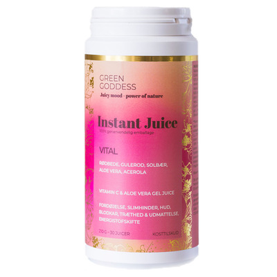 Vital Instant Juice fra Green Goddess er en økologisk, vegansk pulverblanding, som giver kroppen et naturligt boost af vitaminer og antioxidanter.