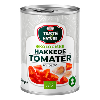 Taste of Nature Hakkede Tomater med hvidløg er perfekte til alverdens sammenkogte retter, pastaretter osv.