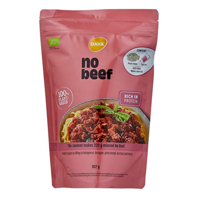 DAVA No Beef Ø er en økologisk køderstatning fremstillet af ekstruderet ærteprotein. Produktet er plantebaseret og har et højt indhold af protein og kostfibre, hvilket gør det til et nærende alternativ til kød. No Beef er alsidigt og egner sig perfekt til retter som bolognese, lasagne, pita, burritos og tacos. Posens indhold giver 320 g færdiglavet No Beef, der kan tilberedes nemt og hurtigt.