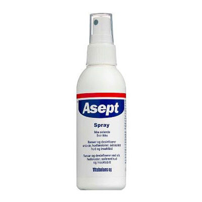 Asept er en desinficerende spray, der renser små sår, hudlæsioner, hudafskrabninger og insektbid samt virker lindrende på solskoldet hud. Sprayens antibakterielle egenskaber mindsker risikoen for infektion ved hudbrud. Den har en let formel, der hverken klistrer eller svier ved brug. Størrelsen er tilmed praktisk og let at medbringe, så den er lige ved hånden, når uheldet er ude. Derudover kan Asept spray fortyndes med vand og anvendes som mundskyl.