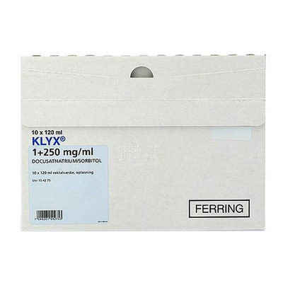 Klyx er et afførende håndkøbslægemiddel. De aktive lægemiddelstoffer er Docusat og Sorbitol.