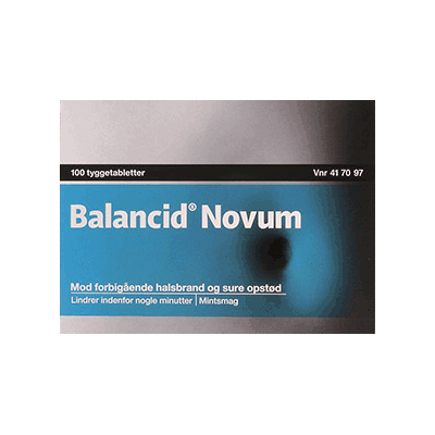 Balancid virker syreneutraliserende på mavesyren. Præparatet anvendes til behandling af sure opstød, spiserørskatar og mavekatar. tabletterne tygges grundigt og har en mild smag af pebermynte. Virkningen viser sig med det samme og varer ca. 1 time.