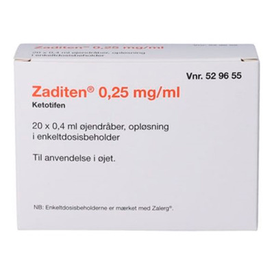 Zaditen 2care4 0,25 mg/ml er et registreret håndkøbslægemiddel til behandling af øjenrelaterede symptomer ved pollenallergi. Øjendråberne indeholder det aktive stof ketotifen, som er et anti-allergisk middel. Zaditen anvendes lokalt i øjet og kan lindre symptomer som kløe, rødme og rindende øjne forårsaget af allergi. Enkeltdosisbeholderne gør det let og hygiejnisk at anvende dråberne på farten.