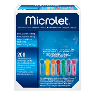 MICROLET® lancetterne kommer i pakker på 200 stk. med syv forskellige farver. Lancetterne er beregnet til engangsbrug, og det anbefales at skifte lancetten efter hver blodprøve. De forskellige farver kan hjælpe dig med at huske at skifte lancetten hver gang. Lancetterne anvendes sammen med MICROLET®NEXT fingerprikker.