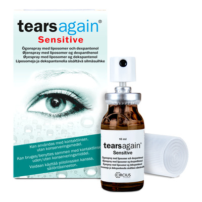 Tearsagain Sensitive er en liposom-øjenspray med dexpantenol, specielt udviklet til at lindre symptomer på tørre, brændende, kløende, trætte, rindende eller irriterede øjne samt følelsen af fremmedlegemer i øjet. Den stabiliserer og beskytter tårefilmen og fugter både øjets overflade og øjenlågene, hvilket gør brugen af kontaktlinser mere behagelig.